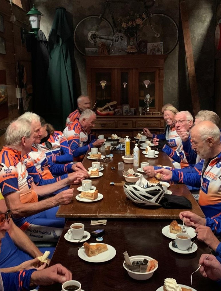 Groep 1 vertrok met toerleider Rien van Hooijdonk, die voor het eerst deze eervolle taak op zich nam, voor de rit met een koffiestop in Strijen. Giel, Herman en Cees Mathijssen waren de medekoprijders deze rit. Vertrokken werd er langs Zegge naar Oudenbosch en Standdaarbuiten. Er werd verder gereden over het mooie fietspad van de Nieuwlandsedijk. Net voor Klundert ging het linksaf naar Zwingelspaan en Tonnekreek en zo langs Bovensluis, waar gelukkig weinig wind stond naar Willemstad. Na het oversteken van het Haringvliet ging het rechtsaf richting Numansdorp. Verder werd er mooi binnendoor gereden naar Strijen. De koffiestop was na 52 km op het zonnige terras bij Le Gris in Strijen. Het was goed toeven met koffie en appelgebak aan een mooi kanaal. De terugweg ging door Mookhoek naar de Kiltunnel, om langs het water van de Dordtsche Kil naar de Moerdijkbrug te rijden. Na de oversteek van de brug ging het richting Zevenbergen. Hier was een weg afgesloten, maar na wat zoeken werd de weg naar de Lamgatsebrug gevonden. Dit was voor de toerleider echter niet de goede weg. Net voor de brug ging het dan ook linksaf. Daar lag een fietspad naar Zwartenberg en hier werd de route naar Etten-Leur weer opgepakt. Het volgende was richting Hoeven en dan weet je het wel: er werd over veel klinkerwegen gereden. Daarna nog een stuk langs Vliegveld Breda Airport en over het viaduct langs de Heimolen, om over de Laagveldsestraat terug naar Huis ten Halve te rijden. De rit was 117 km lang en er waren 12 deelnemers. De zon scheen uitbundig.