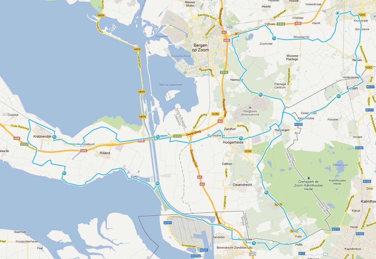 Na de rust ging het via Rijkevorsel en Wortel naar Zondereigen. Voor Zondereigen sloeg Wim een verkeerde weg in en moesten ze even terug. In Zondereigen was de weg richting Baarle Hertog afgesloten en moesten ze omrijden via ... het Bels lijntje!! Zo reden ze naar Baarle Hertog en daarna naar Castelre en Meerle. Hier moest Christ Couwenbergs zijn achterband laten bijvullen met lucht. Via het Paterspad konden ze daarna verder naar Meer. Net over het viaduct reed Wim zijn achterband lek. Hierna reden ze recht toe recht aan over Zundert en Klein-Zundert naar Schijf. Iets voor de Moerse Bossen moest Christ weer zijn achterband laten bijvullen. (geldt volgens hem dus niet als lekke band.... OK Christ !) In Schijf had Wim M. er genoeg van en reed richting Rucphen. Volgens zijn inschatting waren ze om ca. 14.30 uur terug bij Huis ten Halve met 145 km op de teller. Ze hebben geen druppel regen gehad en de thuisblijvers hadden dus weer eens ongelijk.Groep 2 reed met een klein groepje van 5 man bij Huis ten Halve weg. Cees reed op een gifgroen testzadel voor het eerst sinds weken weer mee. Samen met Kees nam hij ook maar meteen de kop, gevolgd door Henk en de ook na een operatie aan zijn hand weer voor het eerst teruggekeerde Jacques van Benthem. Jos Vos probeerde het een kwartier, maar kwam niet in zijn ritme en keerde weer terug naar huis. De rest reed langs prachtige straatnamen als 't Scheel en Heiken naar de rust in Putte. Via Zandvliet, Ossendrecht en Huijbergen ging het daarna weer naar Roosendaal.