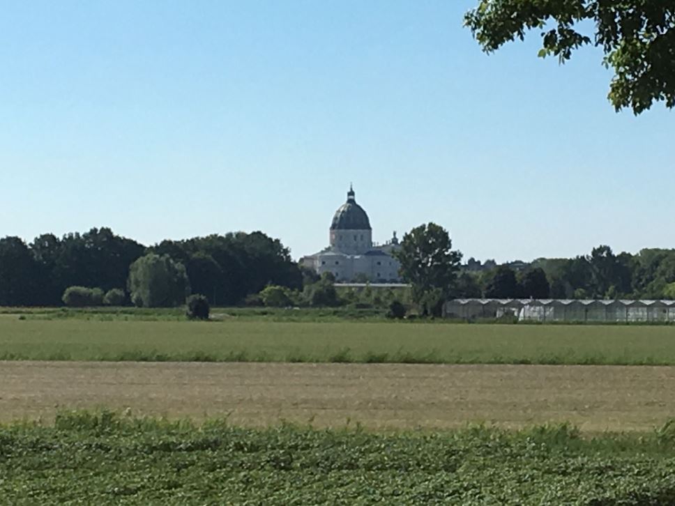 Zondag reed Jan Bakker met Frans van Geloven, Alfons en Toon op kop. Twee jarigen dus, die samen deze week 150 jaar oud waren geworden. Bij dit prachtige zomerweer hadden zich 15 leden gemeld voor groep 1. De 65 km lange Kzieweltoer verliep voorspoedig. Over de Langendijk reden ze naar Seppe, waar vanwege de Westbrabantrally van de dag ervoor het fietspad nog afgezet was. In een rechte lijn reed Jan daarna naar Zevenbergen, dat hij vakkundig rechts liet liggen. De poort van Industrieterrein Moerdijk had Jan keurig op een kier laten zetten zodat hij zo naar Klundert kon rijden. Bij Zwingelspaan werd een plaspauze ingelast en toen Jan een stukje sightseeing Oudenbosch aankondigde reed Hans op de Havendijk lek, zodat er alle gelegenheid was om daar op het gemak van te genieten. De plek was ook ideaal om de basiliek op de foto te zetten, iets wat Robert dan ook niet vergat.