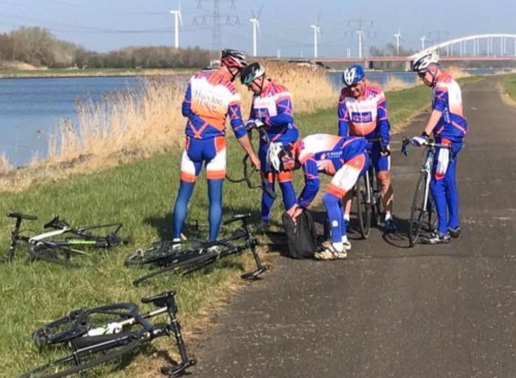 Zaterdag 26 maart reed Alfons met groep 1 zijn nieuwe clubrit Tandje Bij met 16 leden onder een stralend zonnetje en een zwak tot matige oostenwind. Na een rondje langs het theehuisje reden ze via Nispen en de Brembos richting Heimolen. Omdat het fietspad van de Moerkantsebaan helemaal opnieuw geasfalteerd was hoefden de deelnemers daar geen tandje bij te steken achter de voorrijders Alfons, Brian, Toine v. O. en Giel. Bij Huijbergen reden ze langs de Kooiweg naar Hoogerheide, om langs het voetbalveld van WVV via de makkelijkste kant de Rijzende Weg op te rijden. Alweer geen tandje bij dus. Langs Non Plus Ultra kwamen ze via Völckerdorp bij het Schelde-Rijnkanaal, dat helemaal gevolgd werd tot Zandvliet. Omdat de groep daar heerlijk uit de wind reed was dat een mooi moment voor Ad v. Haperen om lek te rijden. Om precies te zijn: twee lekke banden; een binnen- en een buitenband. Gelukkig was topmecanicien Wim Mouws in de groep aanwezig en nadat hij zijn werkbank, materiaalkist, kettingen, pionnen, voorbladen en binnenbanden uit zijn rugzak had gehaald kwam daar ook nog een nieuwe buitenband uit. Zo kon Ad, nadat Wim, Toon J. en Alfons met zijn drieën de buitenband op de velg hadden gelegd, toch zijn weg nog vervolgen. Voor Zandvliet moest een overstekende eend nog wel even een tandje bijzetten om te voorkomen dat de voorrijders hem zouden overrijden. Met een mooie slinger via Berendrecht kwamen ze weer terug in Zandvliet om zo over het nieuwe asfalt van de Steenovenstraat bij Grenszicht in Putte aan de koffie met... te gaan. Aan de zijkant achter het plastic was het heerlijk toeven en moest Toon J. af en toe even moeite doen om niet weg te dommelen. Na de koffie stond Wim al klaar aan de overkant van de straat om terug naar Roosendaal te rijden, maar eerst stond er nog een sightseeing Putte-Stabroek, Putte-Kapellen en Nederlands Putte op het programma. Niet helemaal toevallig de geboortegrond van de toerleider. Terug in Nederlands Putte kwam de groep weer bijna bij Grenszicht, maar deze keer werd er geen koffiestop gehouden, maar werd slalommend links-rechts / rechts-links Putte doorkruist. Terug op de Putseweg reden ze over Huijbergen en Essen-Hoek naar de Hollandse Dreef om zo via de Nigtestraat en Nispen weer naar Huis ten Halve te rijden. Toon Jansen won daar na 101 km de sprint die geen sprint was, omdat niemand meedeed.