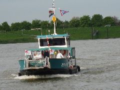 De derde dag namen we om 8 uur afscheid van hotel Zonneheuvel. Omdat Anton tot het fietspontje niet kon volgen hadden we wat extra marge ingebouwd om eventuele lekke banden te kunnen repareren zonder de pont te missen. Natuurlijk reden we nu niet lek, zodat we een klein half uurtje moesten wachten voordat we met de Heen en Weer over de Rijn naar Millingen konden varen. Jacques van Benthem ging op zijn knieën de pont af toen hij een randje over het hoofd zag.
