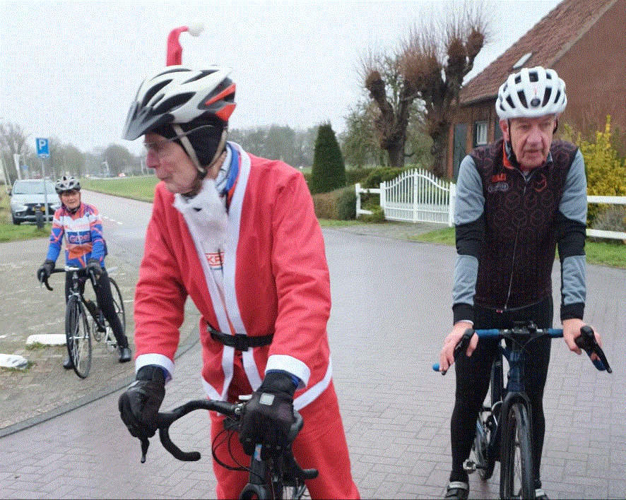 Tweede Kerstdag reden maar liefst 24 leden de kerstrit. John, Cees v. Sluijs en Henk Verschuren reden de kortste weg naar de koffie. Jan Buijk en Cees Mathijssen reden op kop van de groep. Met hun verlichte fietsen en als kerstmannen en -vrouwen verklede fietsers hadden ze veel bekijks. Het was een bonte vrolijke groep. Via Nispen reden ze naar Wouwse Plantage en langs de velden van voetbalclub De Rimboe naar Huijbergen. Daar werd eindelijk teruggedraaid naar Essen-Hoek. Bij de Bostella was het "HO HO HO" (of was het "OH OH OH"?), want daar was de koffiepauze. Het 2e bakje koffie werd door sommigen niet genomen. Een ander drankje kwam daarvoor in de plaats. De terugweg werd in verschillende groepjes gereden. Dit omdat sommigen weer op tijd bij het kerstdiner aanwezig moesten zijn. Er werd iets meer dan 30 km gereden.