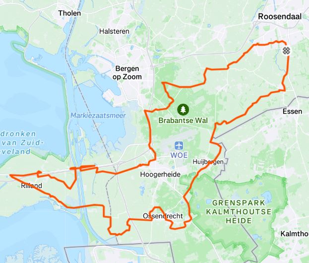 Zowel Toine als Alfons hadden een ritje naar Rilland in de planning. Toine zou bij de Shell in Rilland koffie drinken en Alfons had koffie en appelflappen besteld bij de voetbalkantine van Rillandia. Na kort overleg werd besloten om samen de 80 km lange clubrit Rilland van groep 1 te rijden. De groep van vier, met naast Alfons en Toine, Gerard Mulders en Nienke, vertrok door de Tolberg naar de Wouwse Hil en reed via Brasserie BOZlust naar Heimolen, waar voor Mattemburgh langs de Antwerpsestraatweg gevolgd werd tot Hoogerheide. Via de makkelijke kant reden ze de Rijzende Weg over om daarna langs Non Plus Ultra de polder in te rijden richting Völckerdorp. Tot dan toe hadden ze enkel wat last gehad van wat gemiezer en de sterke wind tegen, maar daarna was het klaar met zachtjes regenen. De regenjasjes gingen aan en de hemelsluizen open. Alhoewel het voetbalveld van Rillandia verleidelijk dichtbij lag werd de lange weg door de polder gewoon uitgereden en kwam er nog een stuk Oude Rijksweg achteraan tot aan de Stationsbuurt. Gerard had er zo zijn twijfels over... Maar gelukkig stond vanaf dat moment de wind in de rug. Aangekomen bij Rillandia stond het vol met toeschouwers onder het afdak van de kantine, die de 4 doorweekte fietsers met respect (en misschien stiekem ook wel een beetje onbegrip) begroetten. Om toch nog een paar vrienden binnen de club over te houden nam Alfons de koffie en de appelflappen voor zijn rekening. Na een half uurtje konden de kantinevrijwilligers de vloer gaan dweilen, gingen de natte kleren weer aan en werd aan de laatste 37 km begonnen. Met wat kleine omwegen over de kasseien van de voormalige Haven van Ossendrecht en door de Trambaan kwamen ze in Ossendrecht. Daar werd nog even het Hageland meegenomen in de route om tenslotte langs het Puts Meuleke, Putseweg, Abdijlaan, Huijbergen, Plantagebaan, Ouwerveldenweg en Nispen met precies 80 km terug bij Huis ten Halve in de stromende regen aan te komen. De thuisblijvers hadden duidelijk gelijk deze keer!