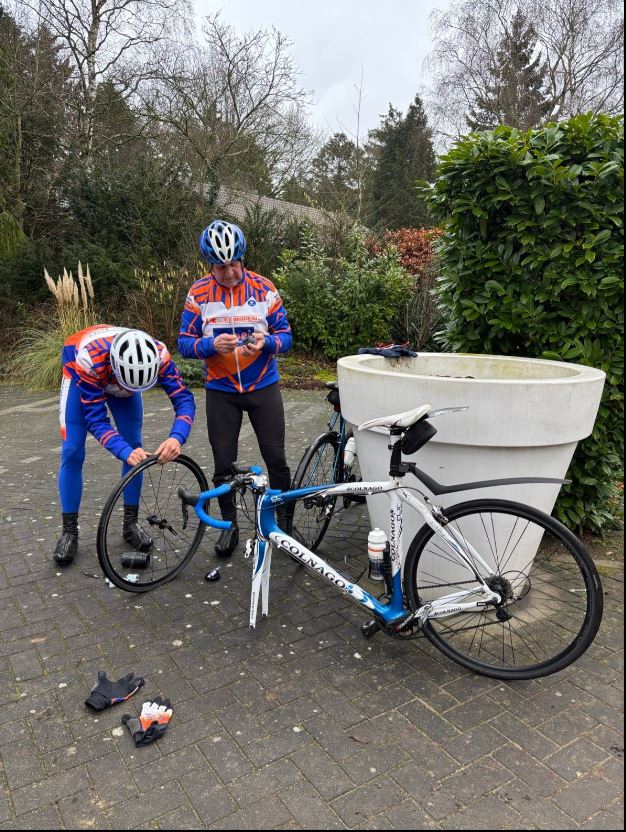 Groep 1 en 2 reden 15 man sterk met Cees Mathijssen een ritje. Over Nispen reden ze naar de Brembosch, over de Wouwse Hil naar de Wouwse Tol en langs Bozlust naar de Heimolen. Daar reed Henny Mannien lek en daarna kon er verder gereden worden vóór en langs Mattemburg naar Non Plus Ultra. Daar doken 8 leden van groep 2 het café in voor en lekker bakje koffie en de 7 overige leden van groep 1 doken de polder in om over de Sophiaweg richting de Bathse brug te rijden. Die lieten ze rechts liggen en draaiden daar terug naar Ossendrecht. Over Calfven reden ze naar Hoogerheide om daarna over Huijbergen, de Kuilweg en Nispen naar de warme erwtensoep te rijden. Groep 2 reed na de koffie en reparatie van de tweede lekke band van Henny meteen naar Hoogerheide en over Huijbergen terug naar Roosendaal. Groep 1 reed 58 km en groep 2 kwam uit op 46 km.