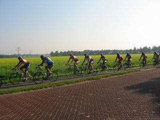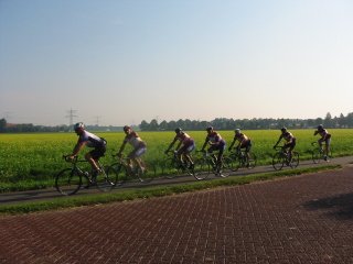 Zondag had John groep 2 en ondergetekende reed met groep 1 de nieuwe clubrit Zuid-West. Het vooruitzicht van lekkere koeken in De Wildert deed 10 leden besluiten om met groep 2 mee te gaan. Helaas ging het ook hier mis, want net voorbij de Wouwse Tol kwam Jack van Zeggeren met zijn voorwiel tegen het achterwiel van zijn voorganger en kwam ten val. Hij nam Jan Dinkelaar in zijn val mee. In zijn helm zaten twee grote deuken en de onderdelen aan zijn stuur waren allemaal verbogen. Jan kwam met schaafwonden aan arm en been uit de strijd. Nadat alles een beetje teruggebogen was, reden Jan en Jack samen terug naar huis, want veilig verder rijden in de groep was niet mogelijk. Terwijl de schade opgenomen werd passeerden wij met groep 1 toevallig ook, maar wij dachten dat er iemand lek had gereden, dus wij hadden de grootste lol. John concludeerde daaruit meteen dat we hem de loef af zouden steken en snel in De Wildert hun plaats in zouden nemen. Maar zo zijn we niet John! (tenminste niet altijd...) Wij reden keurig onze route via Hoogerheide, Ossendrecht en Putte en weer terug via de Kalmthoutse Heide. Onderweg bleek dat diverse mensen de conclusie hadden getrokken dat we de Westbrabantse Ardennen zouden rijden en alle klimmetjes op gingen zoeken. Maar dat stond er niet heren! Alle bultjes werden dus keurig vermeden en in een mooi gelijkmatig tempo werd de Zuidwesthoek doorkruist. Bij Nispen kwamen we precies tegelijkertijd met groep 2 binnen rijden. Dat gaf Jan Buijk wel een goed gevoel, want nu kon hij tenminste zonder te liegen beweren dat hij met groep 1 meegereden was! Door groep 2 op kop werd meteen het tempo fors opgeschroefd en dik boven de 30 op Huis ten Halve afgestormd. Groep 1 kon maar ternauwernood bijhouden!