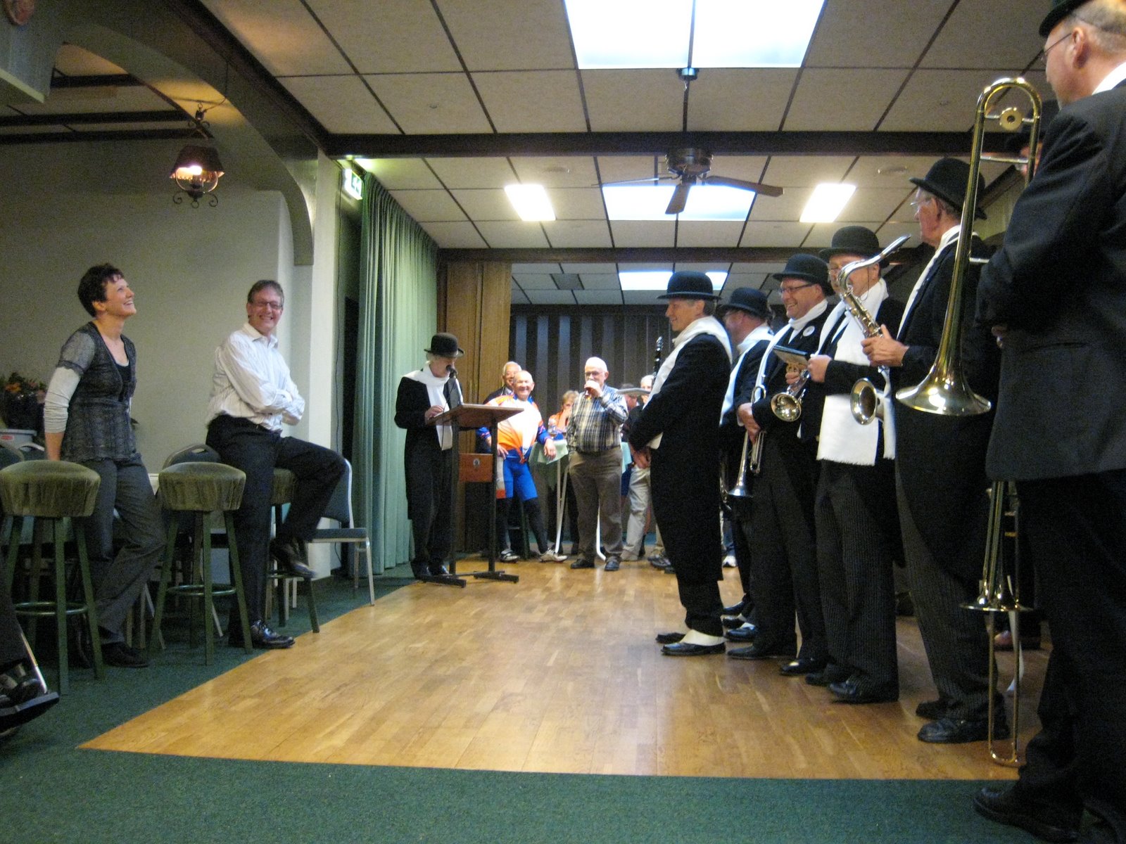 De laatste Euraudaxtocht van AKN op zaterdag 13 september werd druk bezocht. 33 Leden en ex-lid Jantje Neelen waren present om naar camping Liesbos en terug te rijden. We vertrokken bij een temperatuur van een graad of 13, met achter ons Simon als backup in de volgwagen. In de buurt van Zevenbergen reed toerleider Alfons lek. Volgens Tjebbe waren die bandjes van de Aldi toch niet zo erg goed van kwaliteit. Dat bleek te kloppen, want 100 meter verder reed hij zelf lek ! Cees van sluijs had het al voorspeld bij de start, dat het om 11 uur zou gaan regenen. Dat kwam precies uit. Gelukkig meldde het schema dat we om 10:55 uur aan de koffie zouden zitten, dus zaten we lekker binnen toen het begon te plenzen. De lekke banden konden gerepareerd worden, de handen gewassen en precies op tijd konden we weer vertrekken voor de tweede etappe. Ook precies op tijd was het ondertussen opgehouden met regenen. Tot Huis ten Halve bleef het gewoon droog. Dat ook de fietsen van de Aldi van niet zo geweldig goede kwaliteit zijn bleek na kasteel Maxburg, waar Tjebbe zijn trapas los fietste en in de auto plaats moest nemen. Simon was dus duidelijk van dienst deze dag! Met wat hulp van Jan Verbocht kwamen we precies op tijd aan bij de receptie van ons clubhuis Huis ten Halve. De selectie van AKN werd eerst buiten op de foto gezet. Daarna konden we in een lekker vol Huis ten Halve de jubilarissen Stien, Janus, Marian en Jan feliciteren met hun 140-jarig bestaan als familiezaak. (Jan had het eerlijk verdeeld: hij nam 40 jaar voor zijn rekening en Marian de overige 100 jaar). Cees van Sluijs kreeg geen tijd om zijn meegebrachte boterhammen op te eten, want het ene na het andere lekkere hapje werd ons aangeboden. Kostelijk was de rede van de dirigent van het Ermenieke en de aansluitende aubade werd ook erg gewaardeerd. Het werd een geslaagde viering van een bijzonder clublokaal !
