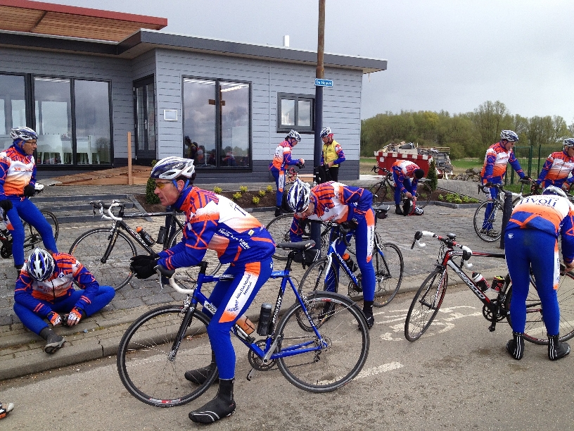 Zaterdag 14 april reden 25 leden de clubrit Tandje Bij van Alfons. De motieven om aan deze rit mee te doen varieerden nogal. Toon Antens kwam om weer eens lekker bij te praten met Cees van Sluijs, maar moest het dus doen met Alfons. Jacques v.d. Heijden kon nog wel een tandje erbij gebruiken in zijn bovengebit. Gerard kwam speciaal voor de kasseien en het tandje erbij bergop. Chris had een vrije dag in de bouw. Het merendeel kwam gewoon lekker kilometers maken bij een temperatuur tussen de 4 en 10 graden en een zwakke noordoostenwind. Net buiten Nispen stopte een tegemoetkomende auto en ging het portierraampje open. Het was geen bestuurder die de weg wilde vragen, maar Arnold die met de kleinkinderen op stap was en iedereen succes wenste! Tot Essen-Hoek reed Chris met Alfons op kop, maar op de kasseien raakte hij iets verderop in het peloton in gesprek met Wil en zat Toon ineens mee op kop. Die bleef daar vervolgens maar rijden. Zo werd er richting Zeeland gekoerst, tot grote vreugde van enkele bestuursleden. Natuurlijk werd de Rijzende Weg daarbij even meegepakt. Vanaf Krabbendijke begonnen in de groep de speculaties over waar er koffie gedronken zou worden; het Dorpshuis in Kruiningen, het Klooster in Rilland, de voetbalkantine van VV Rillandia, het cafeetje bij Bath (!), het restaurant van de golfclub... Het werd uiteindelijk café 't Witte Paard in Putte. Een lekke band van Toon Jansen, die geen lekke band was, na het stukje langs het Schelde-Rijnkanaal leidde tussendoor nog even tot een korte plaspauze. Iets na elven zat de groep met 73 km op de teller aan de koffie. Niet meer bij Leo en Maria, want die hebben per 1 april hun zaak overgedragen aan hun opvolger. De service (en de prijs) is nog gewoon dezelfde gebleven. Na de koffie kwam Toon Jansen naast Alfons op kop rijden. Zo reden ze via Huijbergen (waar Jacques de kortste weg naar huis, of naar de Bostella nam) naar Klavervelden, de Wouwse Tol en de Wouwse Hil. Bas nam daar nog even de kop over van Alfons tot de Brembos. Samen met René ging hij daar rechtstreeks naar Roosendaal. De groep ging rechtsaf via Nispen. Daar nam Frans Peeters samen met Toon de laatste kilometers nog voor zijn rekening. Om 10 voor 1 was de groep weer terug bij Huis ten Halve.