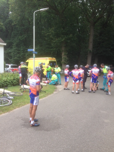 Zondagochtend 17 juli reed Jacq van Benthem met een groep van 20 man sterk zijn Bentbergroute. Op kop werd hij vergezeld door Jacq v.d. Heijden, Jan Mulders, Ilse Mathijssen en Arnold v.d. Maat. Het tempo zat er goed in toen ze voor de wind naar Schijf reden, om vervolgens weer terug te keren over het Scham tot bijna in Horendonk. Door de Grensstraat in Essen reden ze achter het station langs naar Essen-Hoek en zo naar Huijbergen. Over de Abdijlaan reden ze naar Jagersrust en zo door naar Ossendrecht. Over de Trambaan reden ze naar Hoogerheide en linksaf de Onderstal in. Na de Rijzende Weg gepasseerd te zijn werd deze alsnog genomen langs de kasseienkant. Toen ze voor de tweede keer bij de Walkant voorbij kwamen leek het sommigen wel aardig om ook voor de tweede keer de Rijzende Weg langs de kasseienkant te nemen, maar verstandig als Jacq was deed hij dat toch maar niet. Op de hoek van de Beukendreef en de Vossenweg zag Jacq v.d. Heijden een tegemoetkomende fietser over het hoofd en klapten ze vol op elkaar. Omdat ze allebei klaagden over hun rug werd de ambulance gebeld. Dat gaf echter veel problemen, want de meldkamer had Beukendreef Ossendrecht doorgegeven en toen die het niet konden vinden stuurde de meldkamer een tweede ziekenwagen naar de Beukendreef in Putte. Na veel heen en weer gebel kwamen er na zo'n dik half uur 1 auto van de marechaussee, 2 politieauto's en uiteindelijk ook de 2 ambulances ter plekke. Jacq en de onfortuinlijke fietser uit Roosendaal werden ieder samen met hun fiets in een eigen ambulance naar het ziekenhuis in Bergen op Zoom gebracht voor verder onderzoek. Daar werd een gebroken ruggenwervel geconstateerd. Hij wordt daaraan dinsdag in het ziekenhuis in Roosendaal geopereerd en kan de komende dagen nog geen bezoek ontvangen. Van de andere fietser weten we op dit moment nog niet hoe zijn toestand is, maar het ambulancepersoneel vermoedde een aantal gebroken ribben. De groep reed daarna de kortste weg terug naar Roosendaal. Jan Buijk heeft in de loop van de dag Jacq opgezocht in het ziekenhuis en alvast zijn fiets mee naar huis genomen.