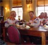 Natuurlijk werd er daarna nog even een luchtje geschept, voordat de avond in de bar afgesloten werd. In de bar werd een gezellig gevarieerd muziekje gedraaid, waarbij aan mijn tafel druk gegokt werd op het jaar waarin een bepaalde plaat een hit was geweest. (Had ik nou toch maar een hele krat Hoegaerden ingezet Arnold, want Angie van de Rolling Stones is dus van 1973 en niet van 1962 zoals jij dacht! Maar goed; 1 Hoegaerden is ook lekker.) Die Hoegaerden moest ik trouwens missen dit clubweekend, want wit bier werd er niet verkocht bij Houben; een klein (en wat mij betreft enig) minpuntje. Theo bekeek alle activiteiten in de bar vanachter zijn gesloten oogleden! Jan Dinkelaar zocht bijtijds zijn bed op, want als je op je 77-ste nog zo goed mee wil komen in de groep dan moet je daar wel wat voor doen. Christ, Toon, Wim en Cees Willemse genoten met volle teugen aan de bar. Rode wijn, bier, jonge en oude klare waren favoriet bij de AKN-ers en bleven dat tot laat in de avond. Dat je het op fris lang vol kunt houden bleek toen voorzitter Pierre onze barman Jack dankbaar aankeek toen die het laatste rondje gaf om half 3: Jan Buijk stond nog steeds vrolijk aan zijn zijde, samen met Henk en ondergetekende.
